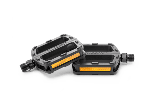 Unsere rutschfesten Plattformpedale aus Kunststoff bieten sicheren Halt und verfügen über Reflektoren für mehr Sichtbarkeit.