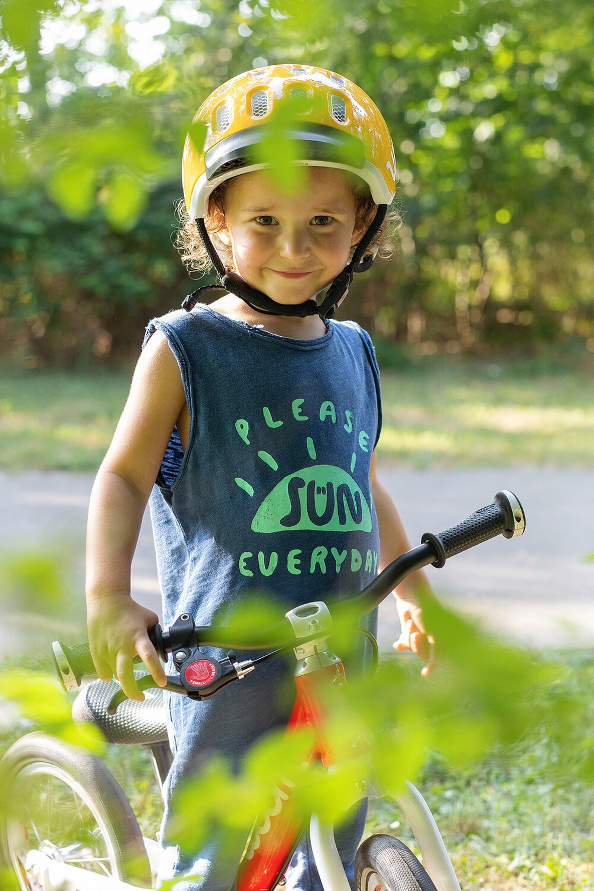 Bei der Gelegenheit kannst du auch gleich die Sattelhöhe überprüfen und anpassen, falls dein Kind gerade einen Wachstumsschub hatte. Aber bitte nicht zu viel auf einmal hochstellen – vor allem wenn ihr eine längere Radl-Pause eingelegt habt, ist es besser, den Sattel vorerst so einzustellen, dass dein Kind gut mit den Füßen am Boden stehen kann. Sobald die Sicherheit am Bike wieder voll da ist, kannst du probieren, den Sattel ein wenig höher zu stellen.