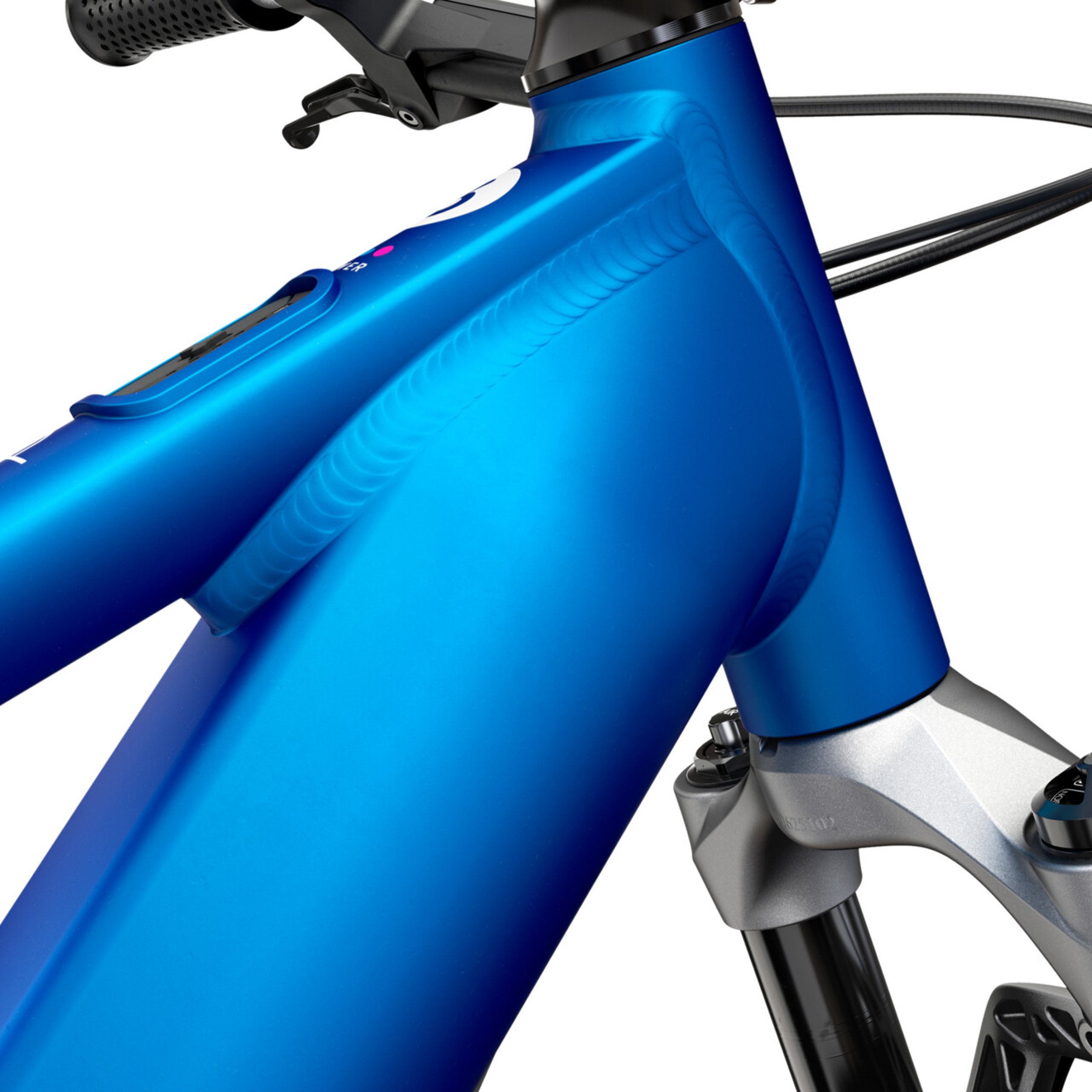 Der ultraleichte Aluminium-Rahmen aus konifizierten, hydrogeformten Rohren zeichnet sich durch eine sportliche Geometrie mit langem Radstand und flachem Lenkwinkel aus. Der tiefgezogene Knick im Oberrohr ermöglicht ein schnelles Absteigen in jeder Situation.