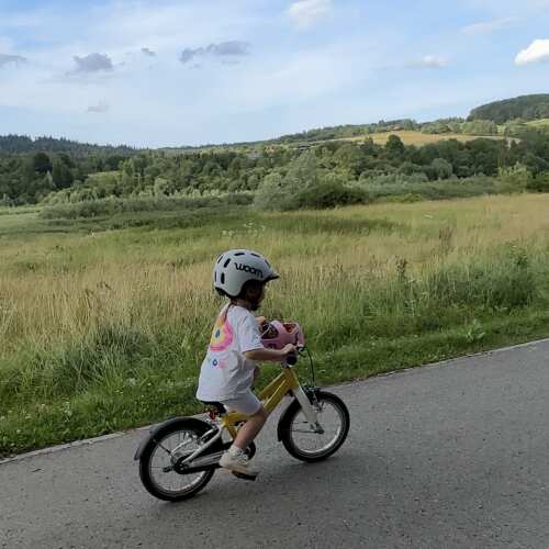 Da die Kleine mit ihren 2,5 Jahren schon recht sicher mit dem WOOM Laufrad unterwegs ist und ihre Freunde bereits mit dem Woom go2 radeln, möchte sie nun auch so gerne eins mit Pedalen. Die sehr gute Erfahrung mit dem Laufrad machte uns die Entscheidung leicht auf das WOOM go2 umzusatteln.
