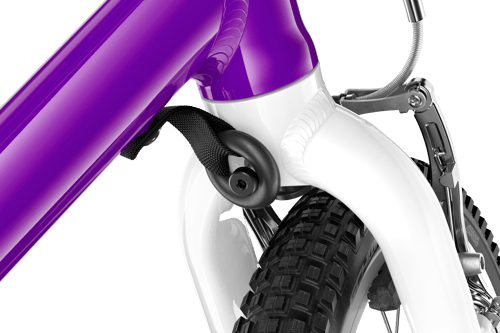 - There's a small rubber ring and webbing strap that link the fork to the downtube to safely limit the amount that the rider can steer. This helps the child to ride in a straighter, more consistent line and prevents potential falls caused by oversteering.