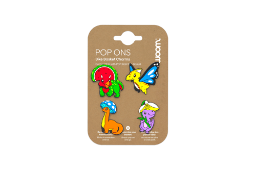 If your young rider keeps running out of storage space on their adventures on two wheels, they need the POP Kids' Bike Basket. This cool accessory is made from BPA-free EVA plastic and has plenty of space for soft toys, snacks, a water bottle and all the treasures that are acquired during outdoor escapades. It couldn’t be easier to pop the basket onto the BMX-style handlebars of woom GO/ORIGINAL bikes in sizes 2, 3, 3 AUTOMAGIC and 4 – and just remove it again when the time comes. The bike basket charms and straps give your child everything they need to make their POP Kids' Bike Basket their own. Each bundle includes four fun florassic park POP ONS Bike Basket Charms and two stretchy POP LOOPS Bike Basket Straps with two more charms – and everything is made from durable, weatherproof material.