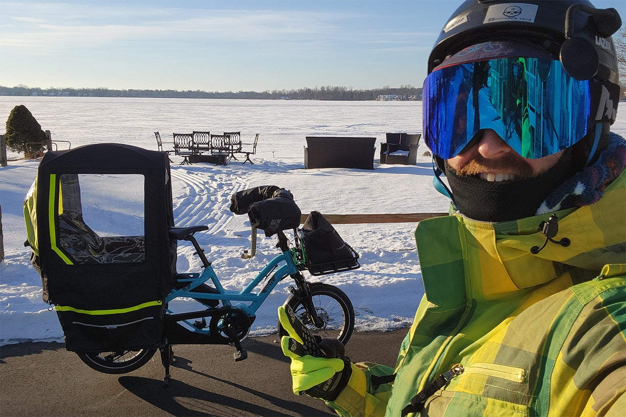 Once winter began, I read over Tern’s winter riding tips, and added “pogies” (a.k.a. bar mitts) to the handlebars to keep my hands warm, bought a neoprene battery cover, and installed the Tern Storm Shield and Tern Storm Box to the cargo area – creating a warm, weather-proof clubhouse for Jack and a few stuffed animal friends to ride snugly inside. There’s something intensely rewarding about it being cold and snowing and asking your toddler if they’re warm, and hearing an emphatic “yeeaa I’m cozy” from the back seat of the bike. My son, in fact, loves his newfound “clubhouse” and gets stoked to climb inside. He sometimes even asks me to take off the extra blanket I put on him since he’s too hot.
