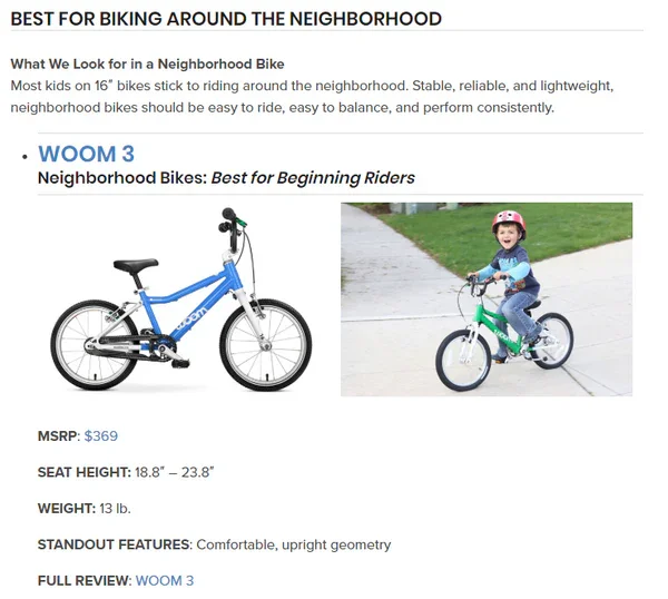 I taught middle school science for five years, so I enjoy the analytical part of getting the data—what does the data say? How much does the bike weigh? What’s the actual seat height? When I created TwoWheelingTots, information like that wasn’t available online or wasn’t readily accessible, and so I just did the dirty work. I used to call bike shops and say, “hey, weigh this bike for me,” or I would go around town and do the measurements myself, and that’s what I would publish in my reviews. I would explain from the analytical side why it was a good bike, not just that my kid liked it.