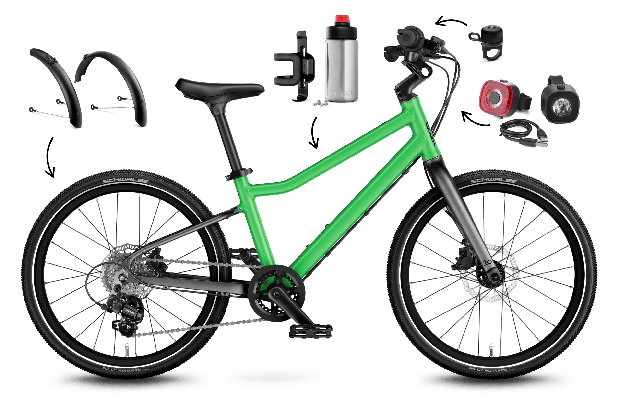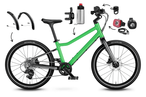 4.60 (16 reviews)This bike and accessory set makes equipping your woom EXPLORE 4 exceptionally easy. Simply select the bike in your chosen color and get ready for your fully-equipped ride! A set of bike lights, fenders, a bike bell, and a water bottle for your woom EXPLORE will be automatically added to your order. What's more, you'll save 20% on the accessories! Kickstand included.
