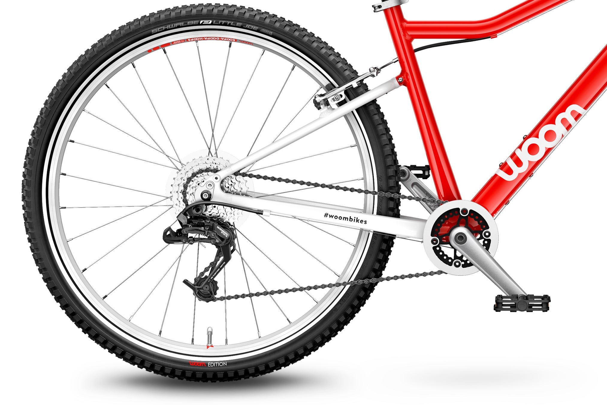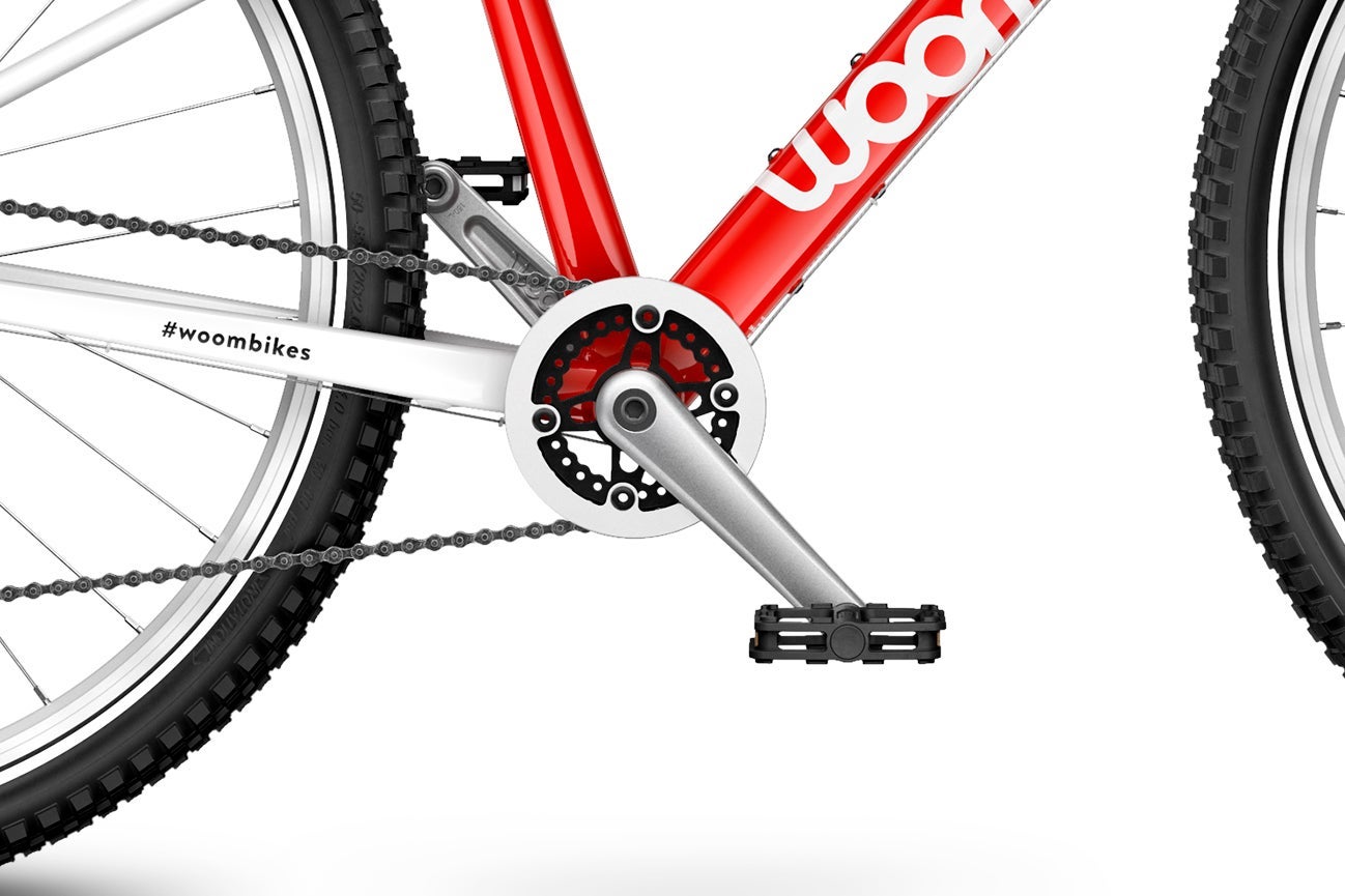 When leveling up to woom’s largest model – the woom 6 – Riders are met with a larger 26” wheelset, longer 5.9” cranks, and an even wider range of gears (the largest cog has 34 teeth), making this the perfect segue to adult bikes later down the road. While these increases in wheel size, crank length, and cassette range all work to bring young cyclists up to speed, that’s not all.