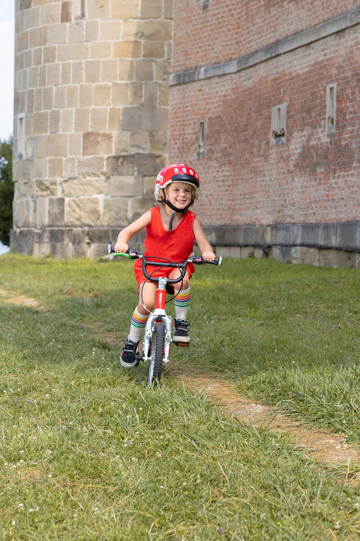 Låt ditt barn aldrig cykla utan cykelhjälm. Kontrollera före cykelturen om hjälmen sitter säkert och bekvämt på barnets huvud.